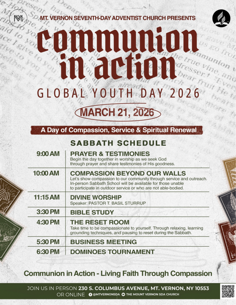 Join us at Mount Vernon SDA Church on March 21st for Global Youth Day 2026: Communion in Action —a powerful day where our youth put their faith into action through service, compassion, and outreach in the community.